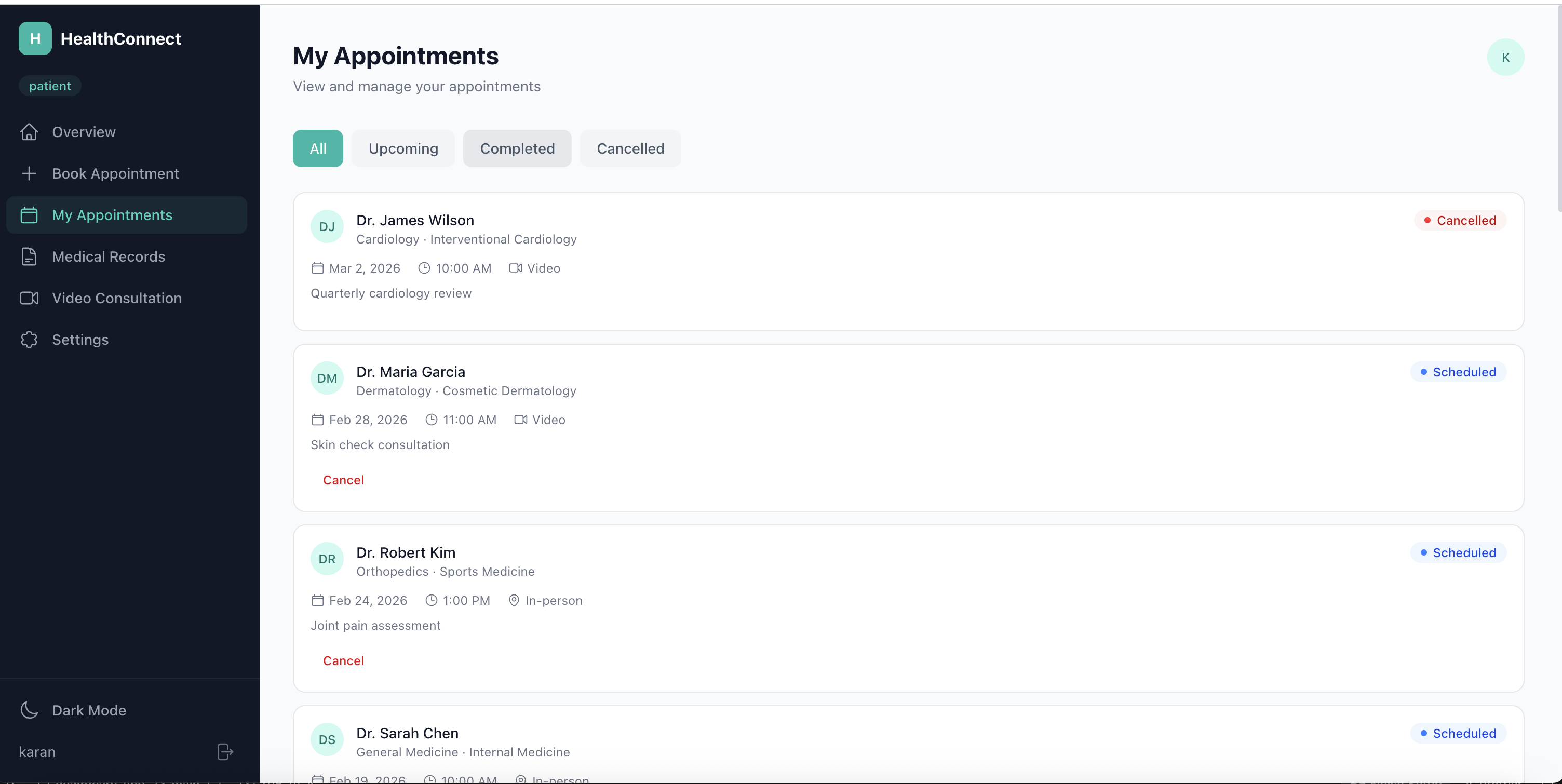 full-stack healthcare platform with role-based dashboards for patients, doctors, and admins — featuring appointment booking, schedule management, medical records, and mock video consultations.